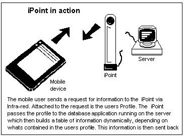 An iPoint is an Information Point. It's intended to be an easy means of delivering useful information to individuals. Roaming, mobile, nomadic, or casual users will be able to retrieve, view and query information about their immediate location or surroundings from iPoints using Pocket PC's and handheld communicators. This information will be tailored to the users' needs, preferences or tastes. It is a brand new type of application which is ideally suited to handheld computers and the new communicators which are emerging. It's something that could become the 'killer application' for this market - eventually, I believe that this type of service will be as common place and easy to use as the telephone.